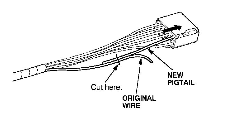 6. Lay the pigtail and the original wire side-by-side, and cut off both ends at once. If you are making more than one splice, do not cut each pigtail at the same location; the resulting "lump" of splice connectors would interfere with rewrapping the harness. Instead, cut the first pigtail close enough to the terminal so you will have room to make each remaining cut about 20 mm (3/4 inch) farther down on the next pigtail.