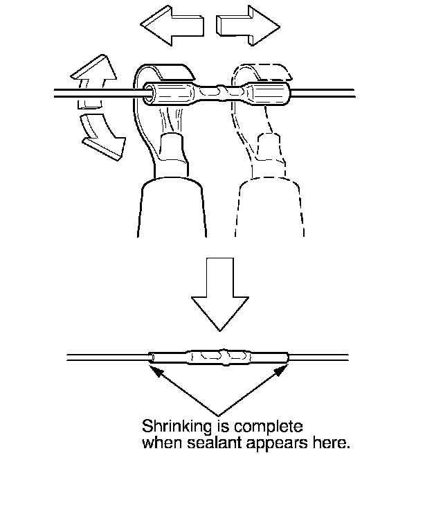 13. Plug in the heat gun, and turn it on. Start at the middle of the splice connector, and move the gun toward the ends as the tube shrinks. Apply heat evenly by rotating the curved heat spreader around the splice connector. Shrinking is complete when a small amount of sealant appears at each end of the tube.
