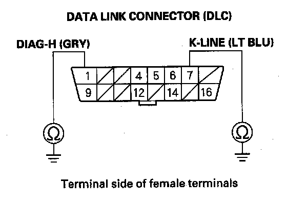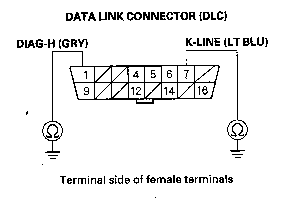 16. Check for continuity between body ground and DLC terminals No. 1 and No. 7 individually.