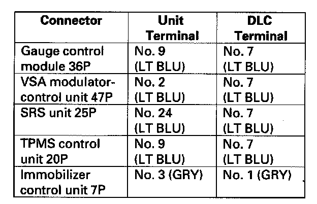 NO - Repair short in the wire between the DLC No. 7 (K-line) and the VSA modulator-control unit, the SRS unit, the TPMS control unit, or the gauge control module, or DLC No. 1 (DIAG-H line) and the immobilizer control unit.