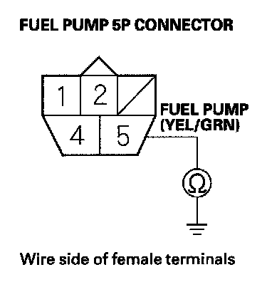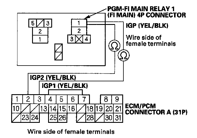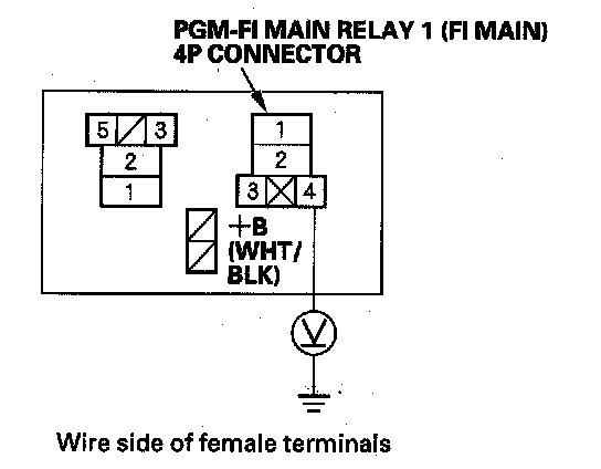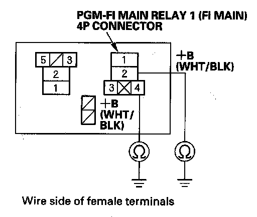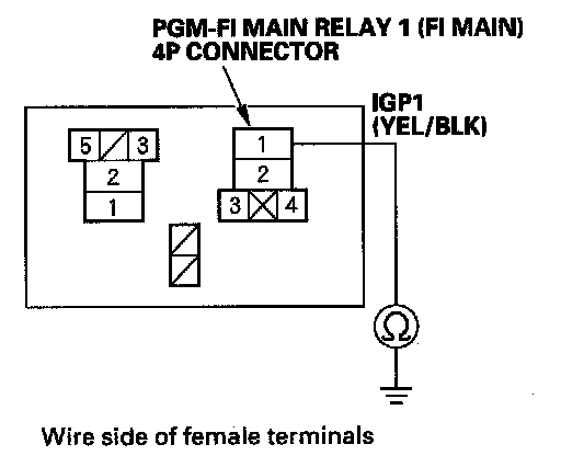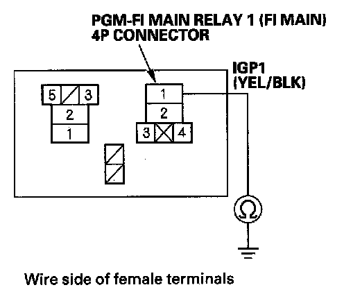 44. Check for continuity between PGM-FI main relay 1 (FI MAIN) 4P connector terminal No. 1 and body ground.