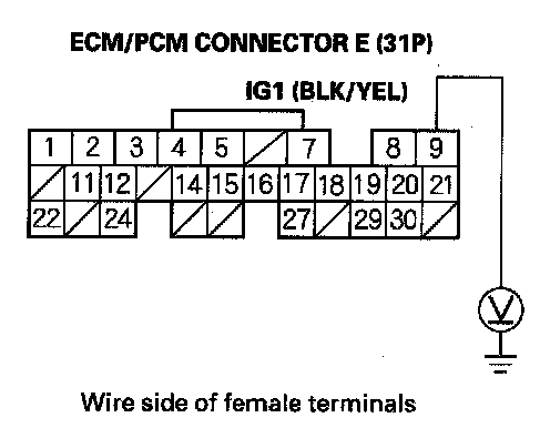 61. Measure voltage between ECM/PCM connector terminal E9 and body ground.
