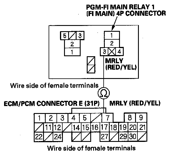 NO - Repair open in the wire between PGM-FI main relay 1 (FI MAIN) and the ECM/PCM (A2, A3).