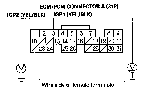 69. Measure voltage between body ground and ECM/PCM connector terminals A2 and A3 individually.