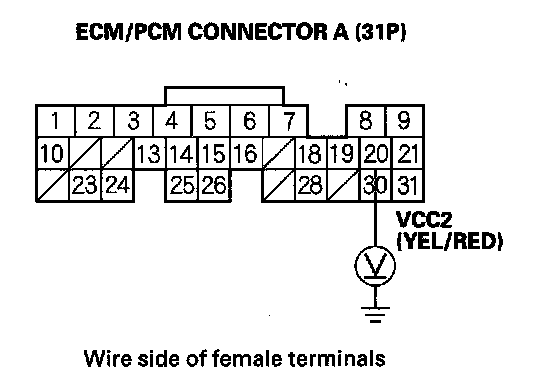 83. Disconnect the connector from each of these sensors, one at a time, while measuring voltage between body ground and ECM/PCM connector terminal A20 with the ignition switch ON (II).