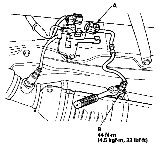 1. Disconnect the secondary HO2S 4P connector (A), then remove the secondary HO2S (B).