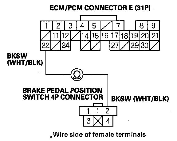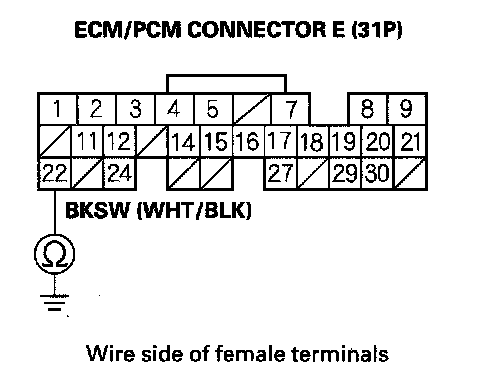 9. Check for continuity between ECM/PCM connector terminal E22 and brake pedal position switch 4P connector terminal No. 2.