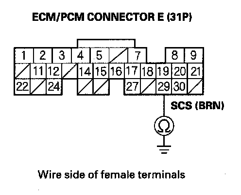 7. Check for continuity between ECM/PCM connector terminal E29 and body ground.