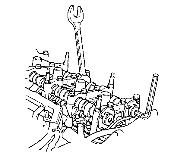 2. Hold the exhaust camshaft with an open-end wrench, then loosen the bolt.