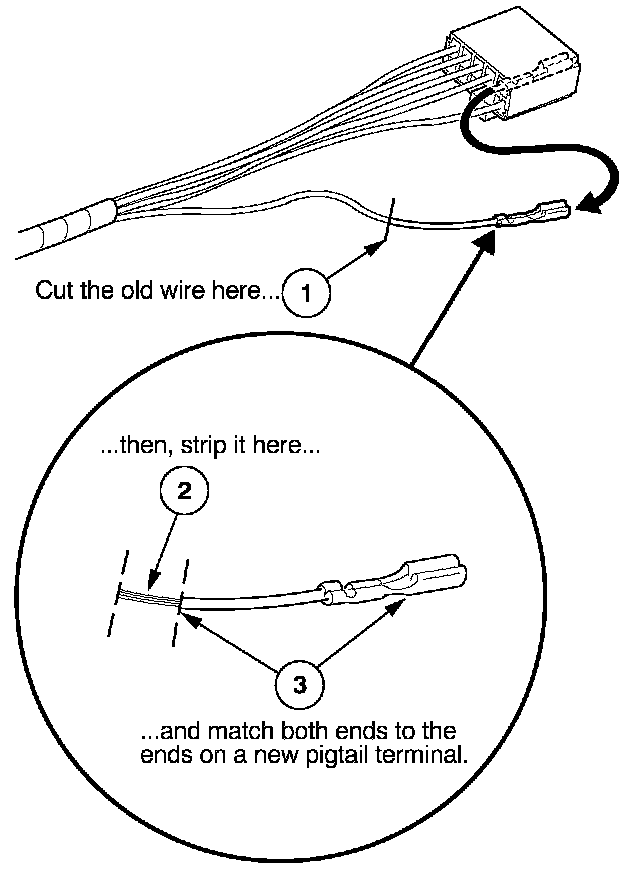 2. Cut off the wire about an inch back from where it connects to the damaged or faulty terminal, then strip about half of the insulation off that piece. This will be used to size the wire end of the replacement pigtail terminal.
