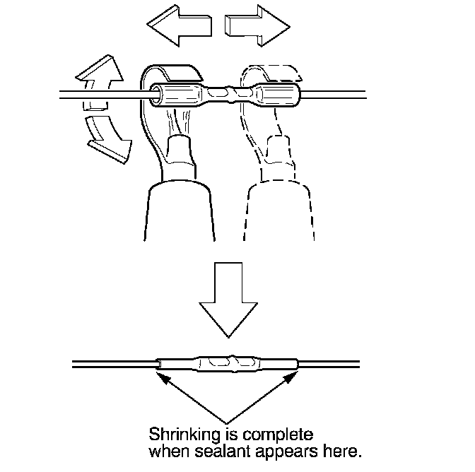 13. Plug in the heat gun, and turn it on. Start at the middle of the splice connector, and move the gun toward the ends as the tube shrinks. Apply heat evenly by rotating the curved heat spreader around the splice connector. Shrinking is complete when a small amount of sealant appears at each end of the tube.