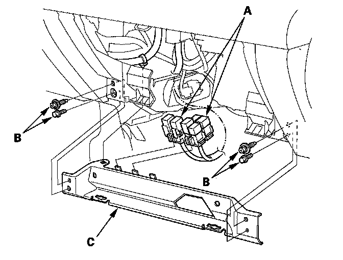 10. Remove the relays (A), then remove the bolts (B) and the glove box frame (C).