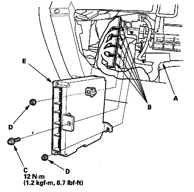 14. Remove the nuts (D), then remove the ECM/PCM (E).