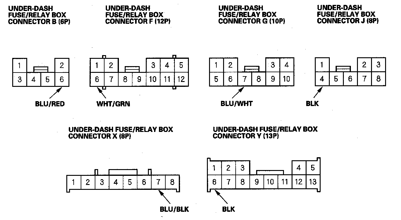 3. Disconnect the under-dash fuse/relay box connectors B, F, G, J, X and Y.