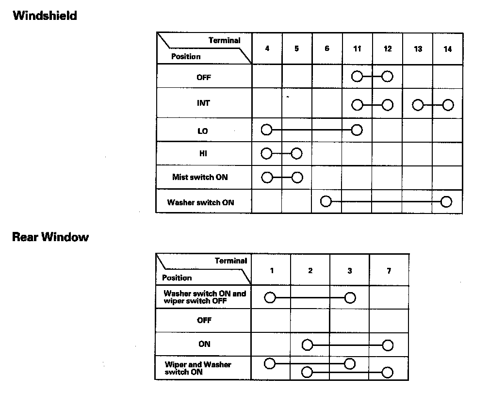 - If the terminals look OK, check for continuity between the terminals in each switch position according to the tables. If the continuity is not as specified, replace the switch.