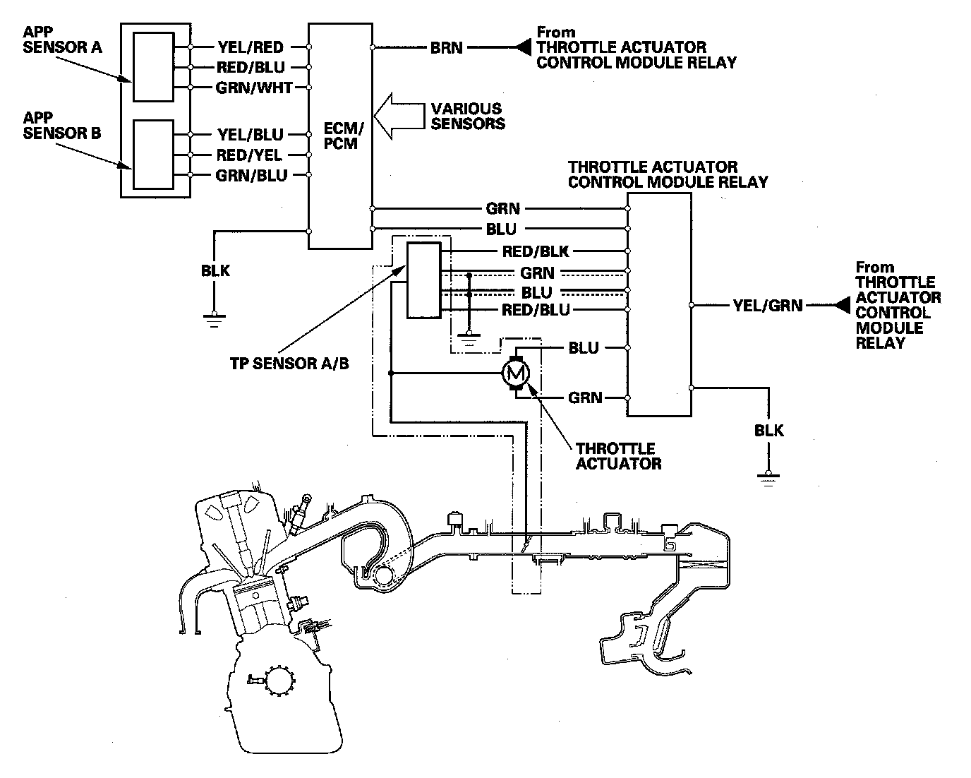 The electronic throttle control system consists of the throttle actuator, throttle position (TP) sensor A/B, accelerator pedal position (APP) sensor A/B, throttle actuator control module, throttle actuator control module relay, and the ECM/PCM.
