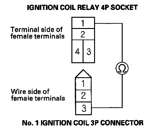 4. Check for continuity between ignition coil relay 4P socket terminal No. 1 and the No. 1 ignition coil 3P connector terminal No. 3.