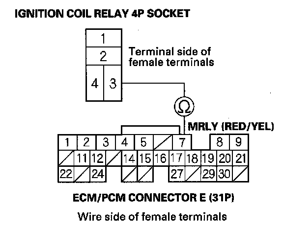 NO - Repair open in the wire between ignition coil relay 4P socket terminal No. 3 and the ECM/PCM (E7).