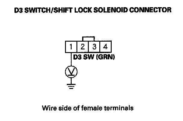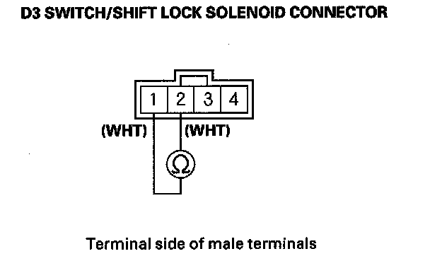 7. Check for continuity between D3 switch/shift lock solenoid terminals No. 1 and No. 2 while pressing switch and when the switch is released.