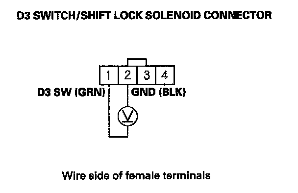10. Measure voltage between D3 switch/shift lock solenoid connector terminals No. 1 and No. 2.