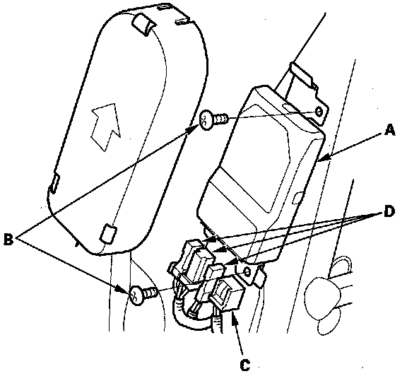 1. Place the new ODS unit (A) on the seat-back frame. Tighten the two bolts (B), and connect the ODS unit harness 18P connector (C) and sensor connectors (D) to the ODS unit.