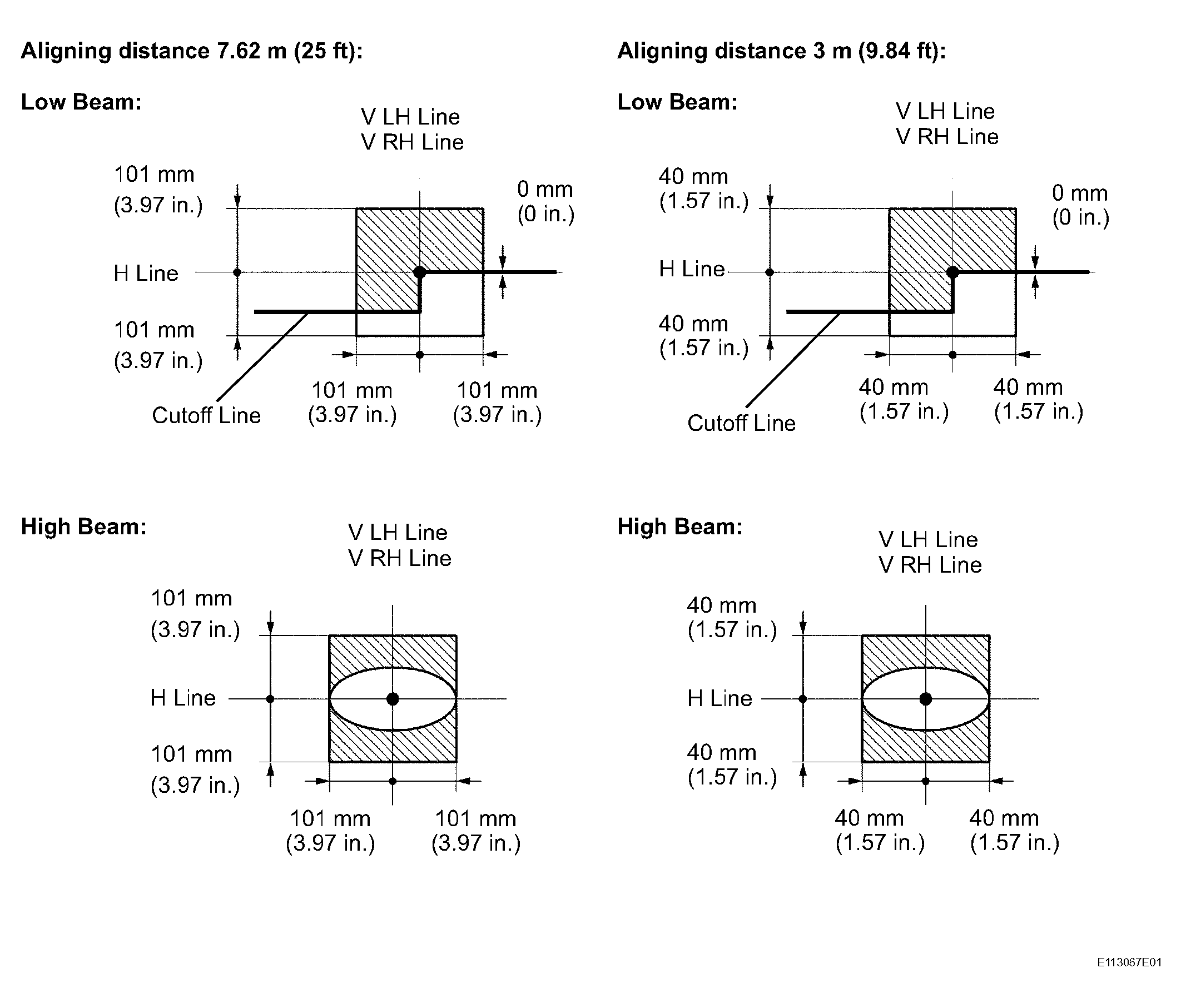 The cutoff line is 101 mm (3.97 in.) above and below the H line as well as to the left and right of the V line with high-beam (SAEJ599).