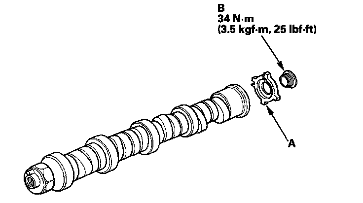 1. Install the CMP pulse plate (A) and CMP pulse plate mounting bolt (B) on both camshaft. Wipe them clean and lubricate the mounting bolt threads with new engine oil. Torque the bolt to 34 N.m (3.5 kgf.m, 25 lbf.ft).