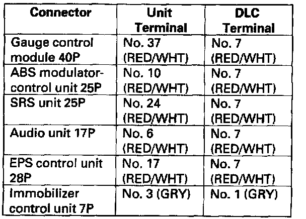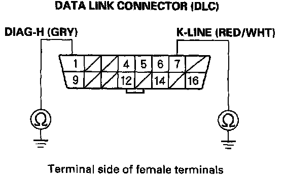 16. Check for continuity between body ground and DLC terminals No. 1 and No. 7 individually.