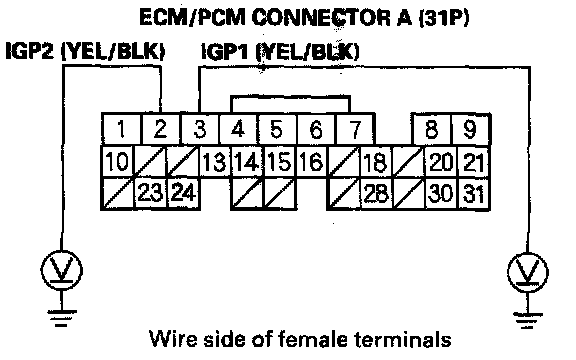 69. Measure voltage between body ground and ECM/PCM connector terminals A2 and A3 individually.
