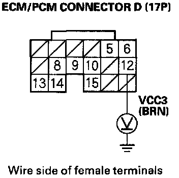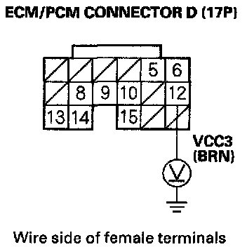 95. Disconnect the connector from each of these sensors, one at time, while measuring voltage between body ground and ECM/PCM connector terminal E5 with the ignition switch ON (II).