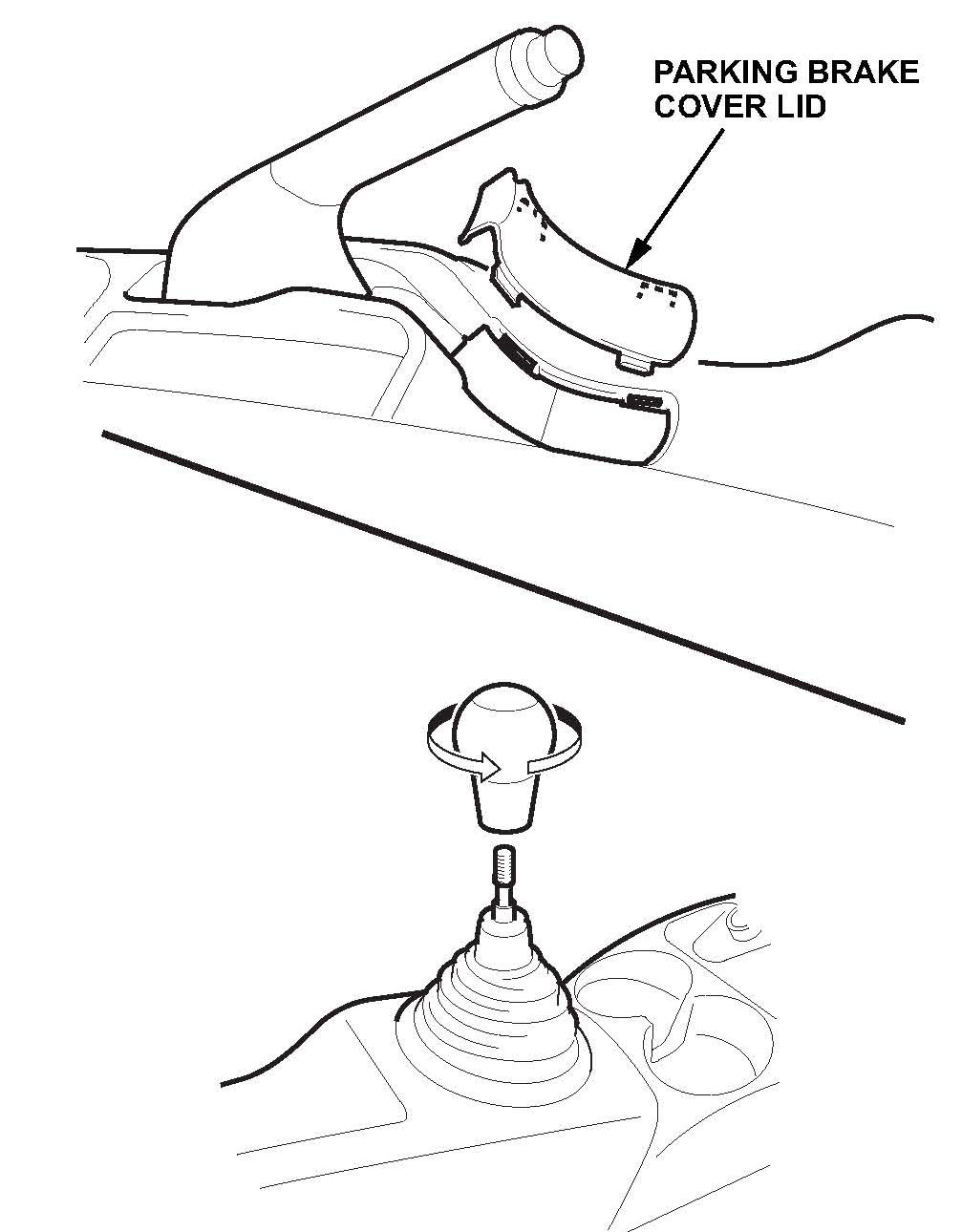 1. Remove the parking brake cover lid. On M/T models, remove the shift knob.