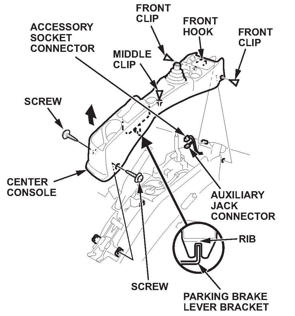 12. Reinstall the center console. Make sure that the wire harness is not pinched, all the connectors are reconnected, and the console is properly installed onto the parking lever bracket. Replace any damaged trim clips.