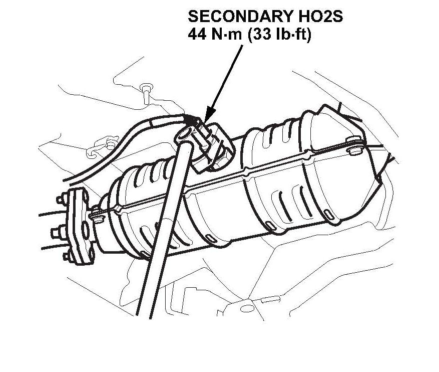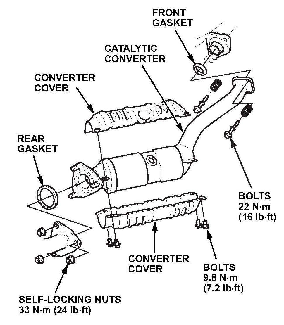8. Install the new catalytic converter with new front and rear gaskets, new self-locking nuts, and new flexible joint bolts. Torque the self-locking nuts to 33 N.m (24 lb-ft); torque the flexible joint bolts to 22 N.m (16 lb-ft).