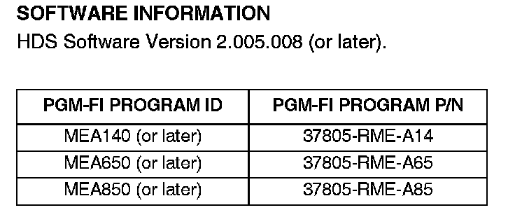 Use the HDS (with software version 2.005.008 (or later) to update the ECM/PCM PGM-FI software. Refer to Service Bulletin 01-026, Updating the ECM/PCM.