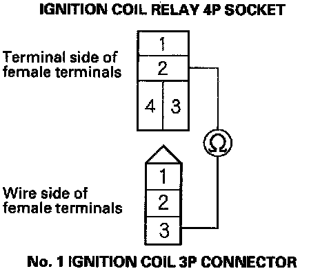 4. Check for continuity between ignition coil relay 4P socket terminal No.2 and the No.1 ignition coil 3P connector terminal No.3.