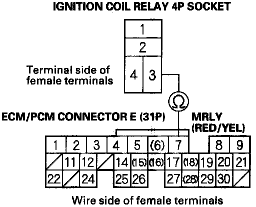 11. Check for continuity between ignition coil relay 4P socket terminal No.3 and ECM/PCM connector terminal E7.