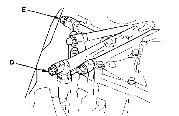 20. Connect the oil pressure gauge to the 3rd clutch pressure inspection port (D) and the 4th clutch pressure inspection port (E).