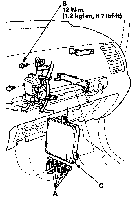 13. Disconnect the connectors (A), and remove the bolts (B) then remove the ECM/PCM (C).