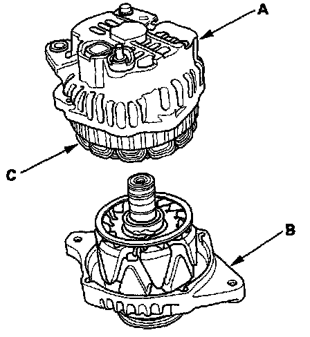 6. Separate the rear housing (A) and the drive-end housing (B) with the stator (C) attached to the rear housing.