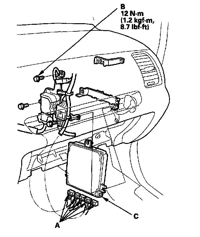 8. Disconnect the connectors (A), and remove the bolts (B), then remove the PCM (C).