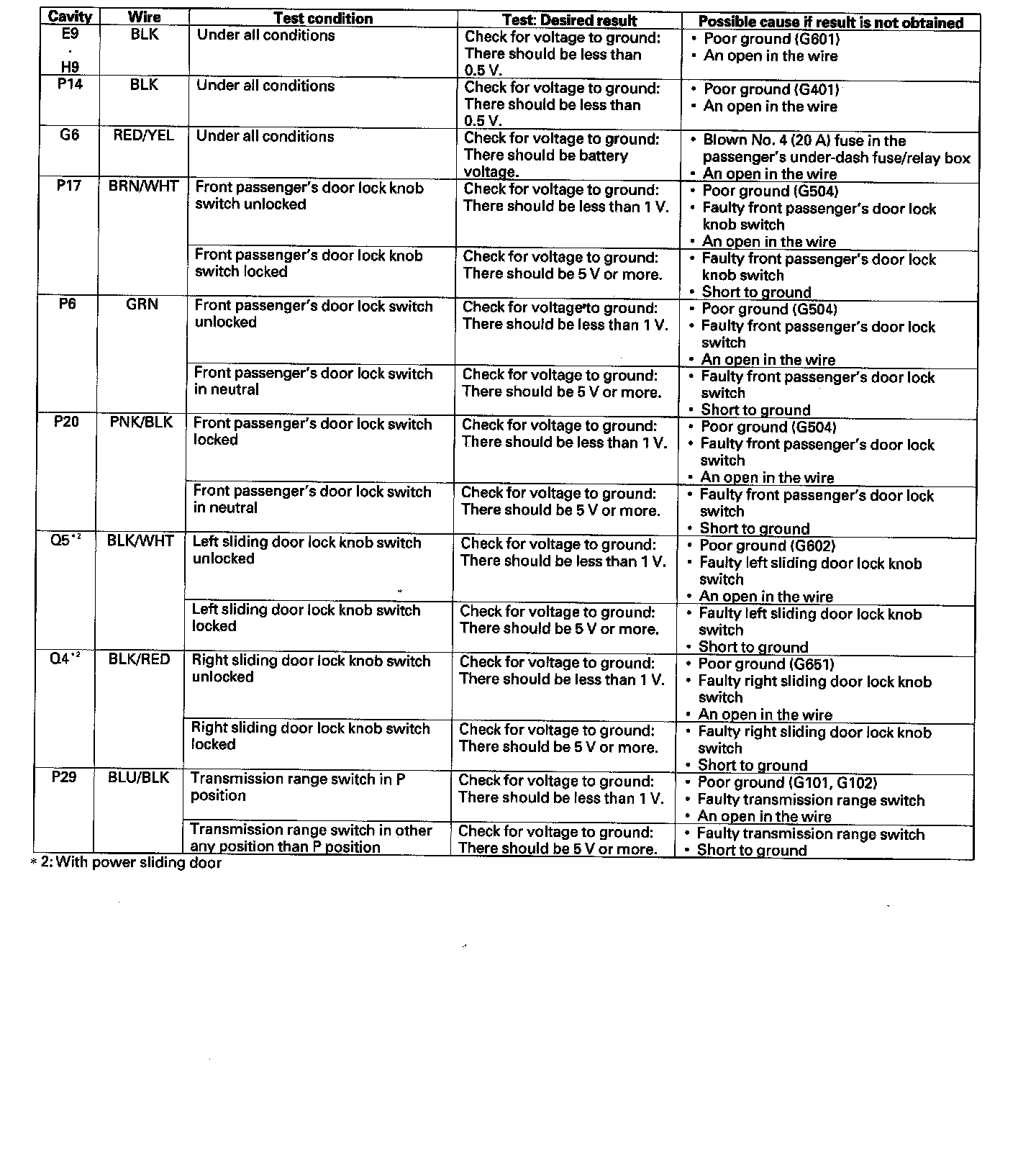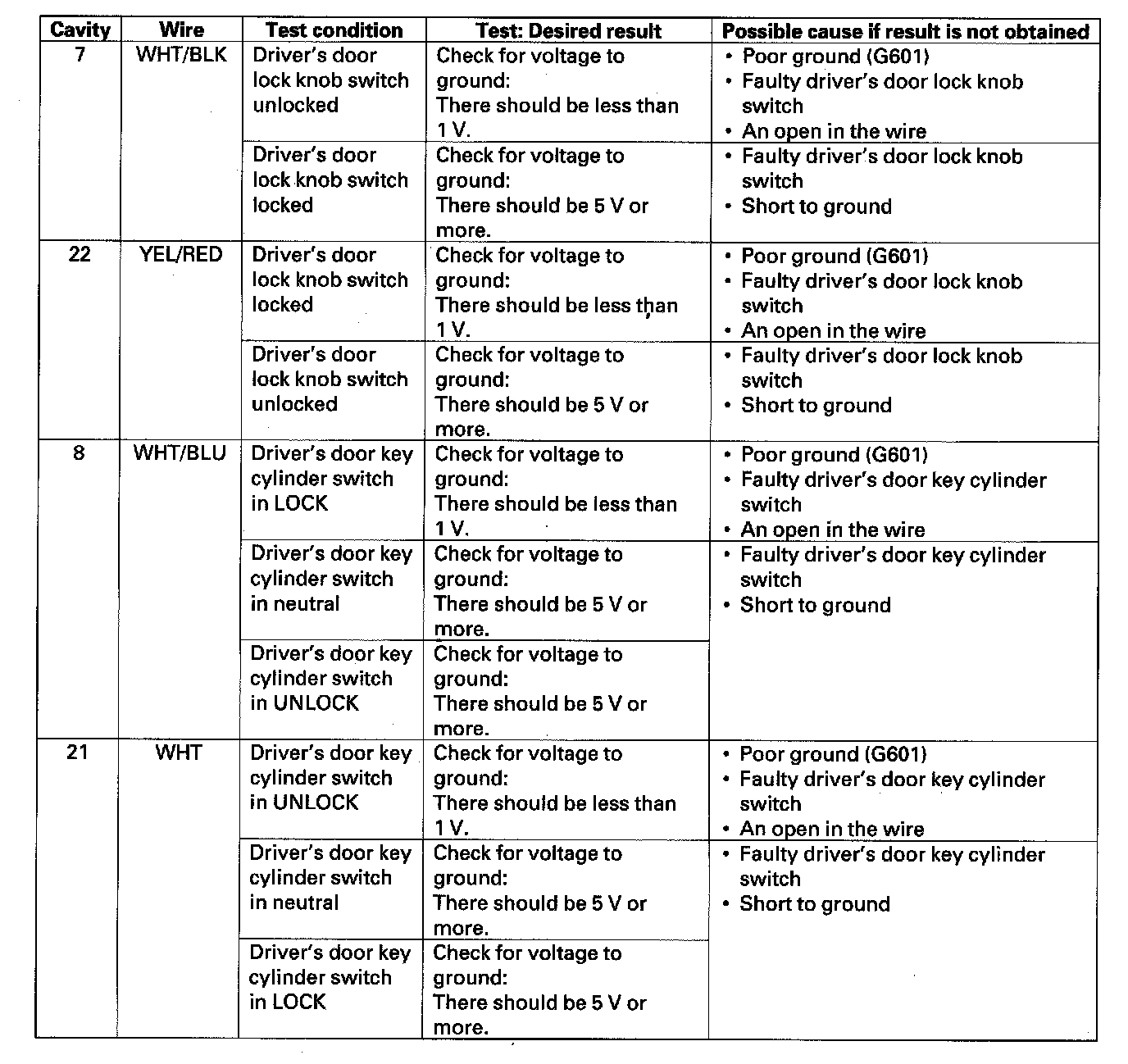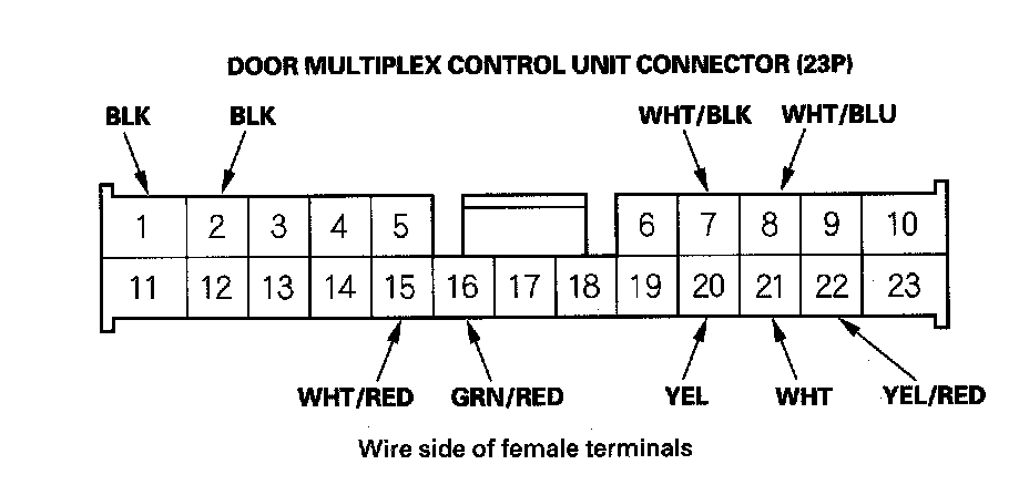 24. Reconnect the connector to the door multiplex control unit. Turn the ignition switch ON (II) and make these input tests at the connectors.