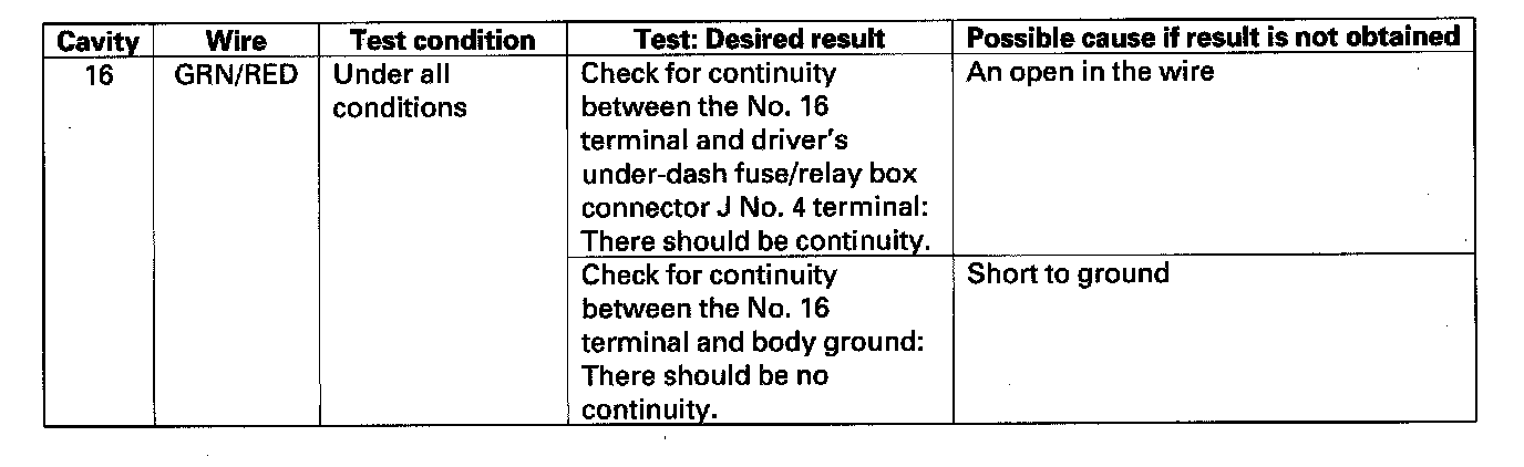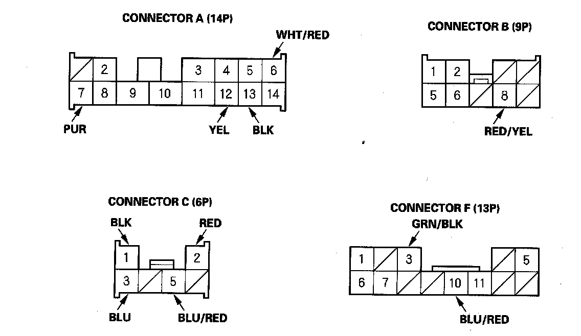 6. Reconnect all connectors to the driver's under-dash fuse/relay box. Turn the ignition switch ON (II), and make these input tests at the appropriate connectors on the driver's under-dash fuse/relay box.