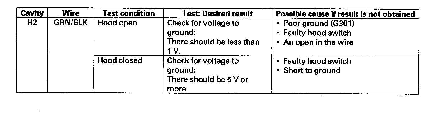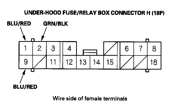 18. Reconnect the connector to the under-hood fuse/relay box, turn the ignition switch ON (II) and make the input test at the appropriate connector on the under-hood fuse/relay box.