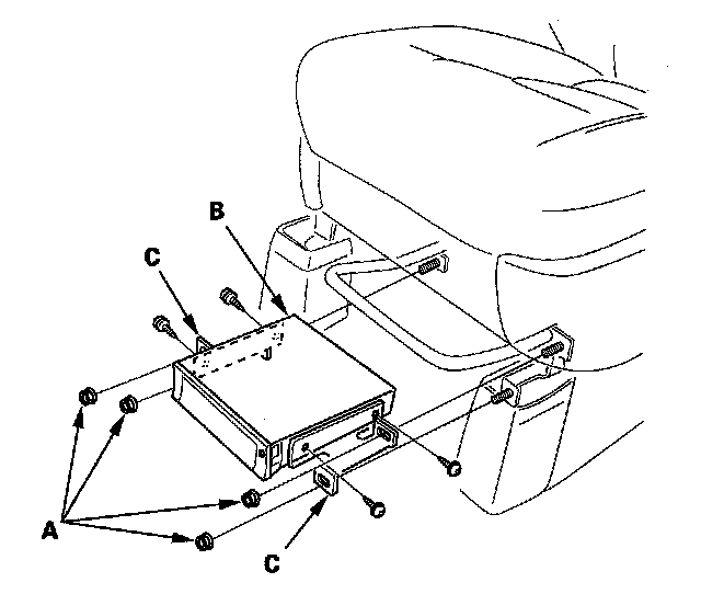 6. Move the driver's seat all the way back, and remove the four mounting nuts (A), then remove the navigation unit (B) with brackets (C) from the driver's seat.