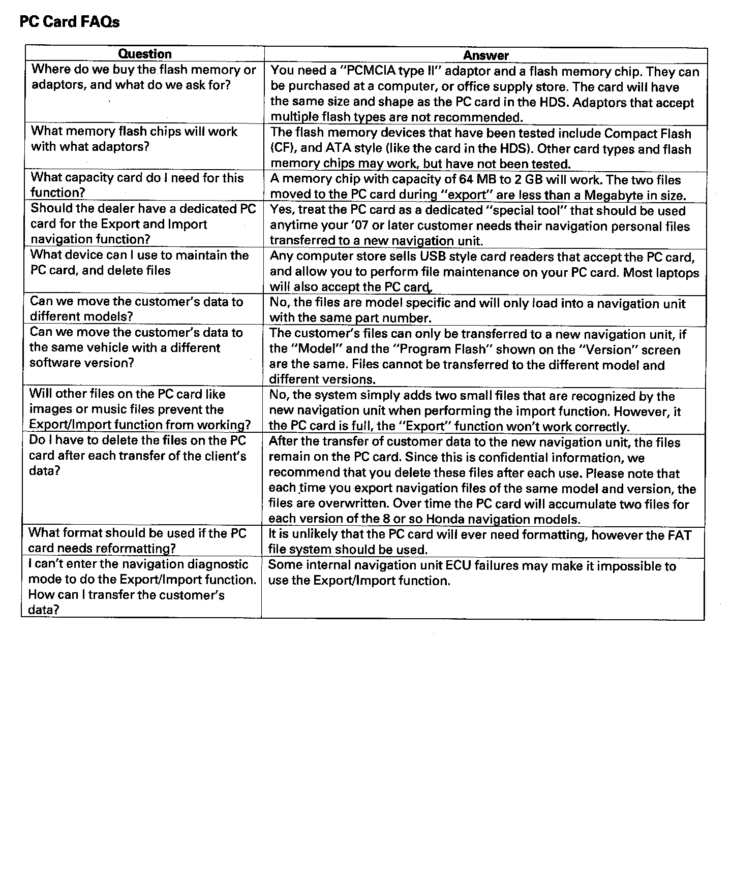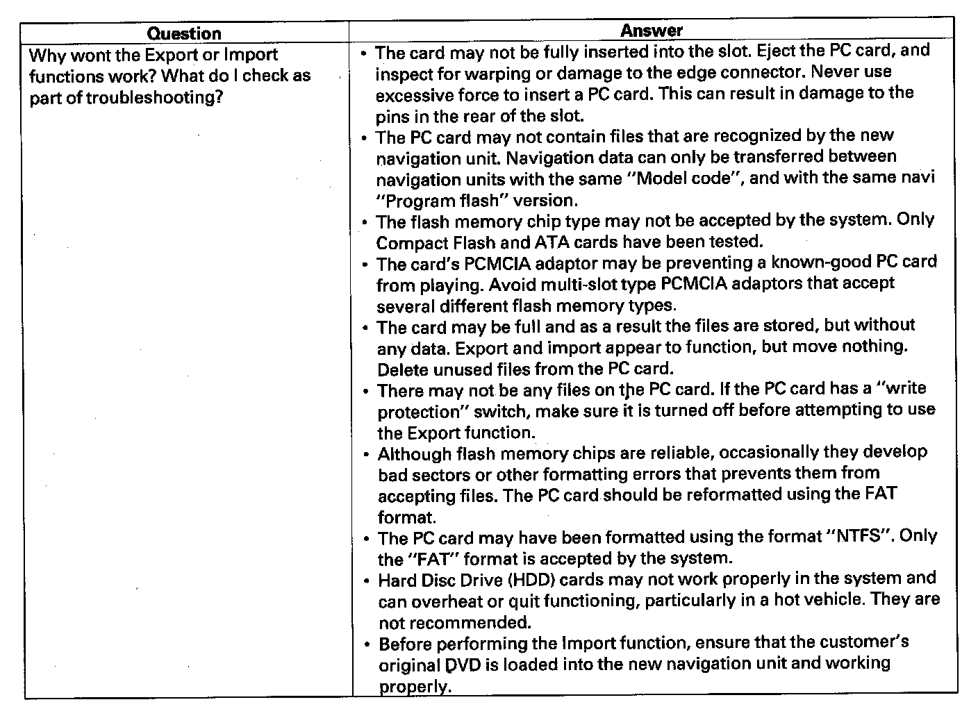 When replacing the navigation unit, this function allows the dealer to transfer the customer's personal data to the new navigation unit. The transferred information includes their Setup settings, and personal addresses. The dealer inserts a PC card to the navigation unit, and then selects the "Save Users Memory" function. The two functions in this diagnostic screen are EXPORT and IMPORT. EXPORT saves the customer's data to the PC card, and IMPORT moves the PC card files to the new navigation unit.