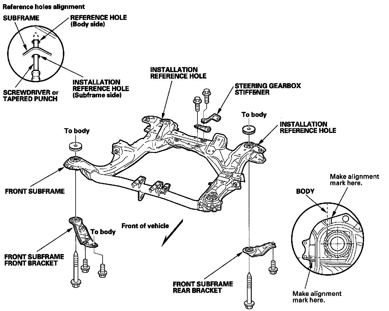 - After mounting the subframe and brackets loosely, align the reference marks with the body, then tighten the bolts.