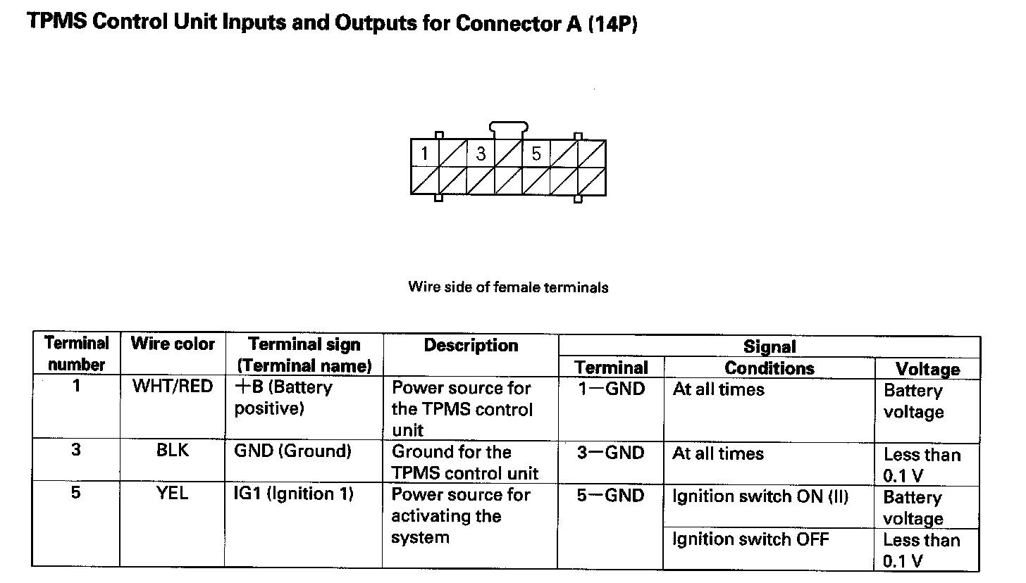 TPMS Control Unit Inputs and Outputs for Connector A (14P):