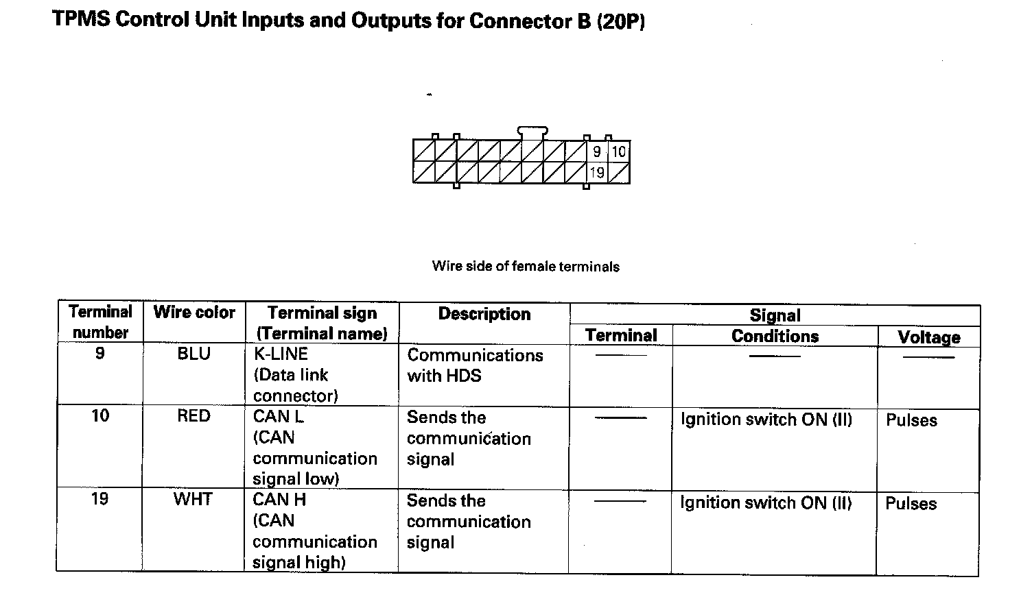 TPMS Control Unit Inputs and Outputs for Connector B (20P):