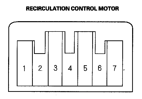 2. Connect battery power to the No. 1 terminal of the recirculation control motor, and ground the No. 5 and No. 7 terminals; the recirculation control motor should run smoothly. To avoid damaging the recirculation control motor, do not reverse power and ground. Disconnect the No. 5 or No. 7 terminals from ground; the recirculation control motor should stop at Fresh (when the No. 7 terminal is disconnected) or Recirculate (when the No. 5 terminal is disconnected). Don't cycle the recirculation control motor for a long time.