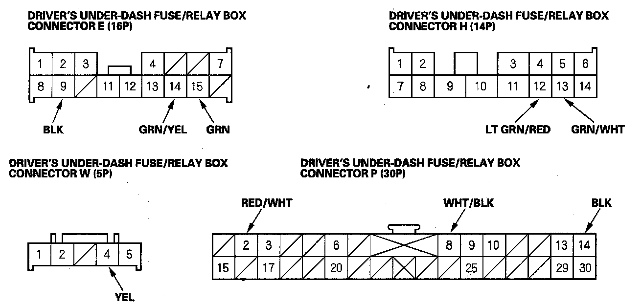 6. Reconnect the connectors to the driver's under-dash fuse/relay box. Turn the ignition switch ON (II), and make these input tests at the appropriate connectors on the driver's under-dash fuse/relay box.